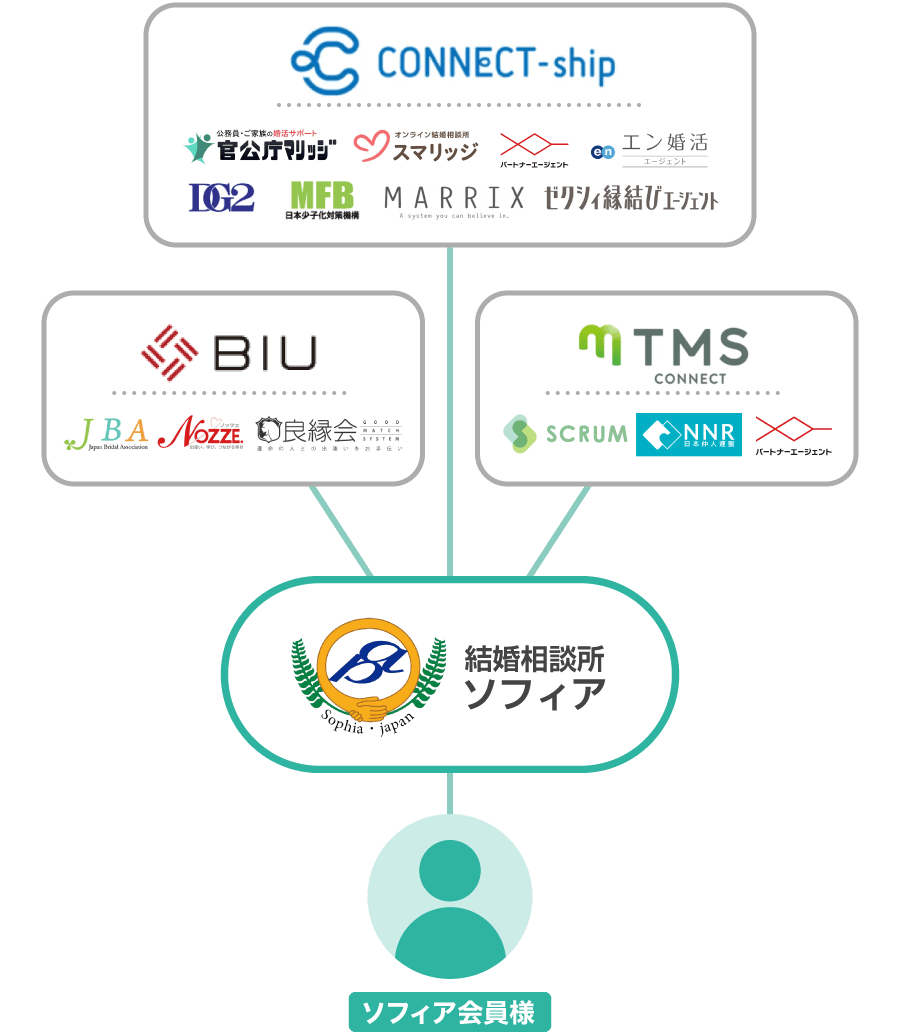 ソフィアでは、全国対応で会員様のサポートが可能です。また、ほとんどの結婚相談所は同一のシステムで繋がっているため、どこの結婚相談所に入会してもご紹介できる会員様はほとんど同じになります。